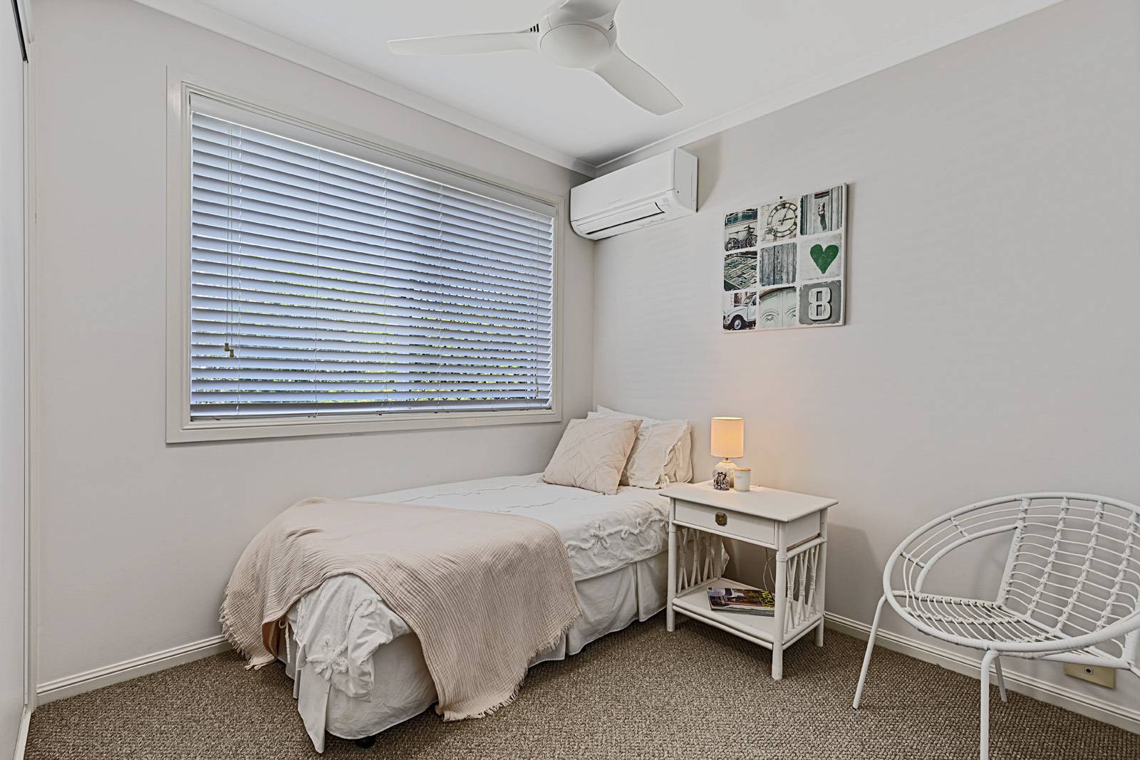 The open living area is air-conditioned, and the property includes ample storage, security, and two car spaces, including a lock-up garage.